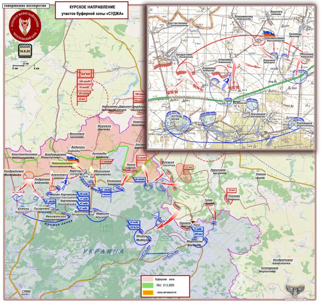 На Сумском направлении в районе Тёткино продолжаются накаты противника со стороны Рыжевки и Бессаловки. По данным с мест, замечены испаноязычные наёмники. МО РФ сообщило об освобождении Новониколаевки, что в 5 км западнее Юнаковки. Между ними остаётся одно село, подконтрольное ВСУ – Варачино. После его освобождения ВС РФ смогут широким фронтом продвинуться к каскаду сёл Малая Корчаковка – Корчаковка – Новая Сечь – Храповщина.
