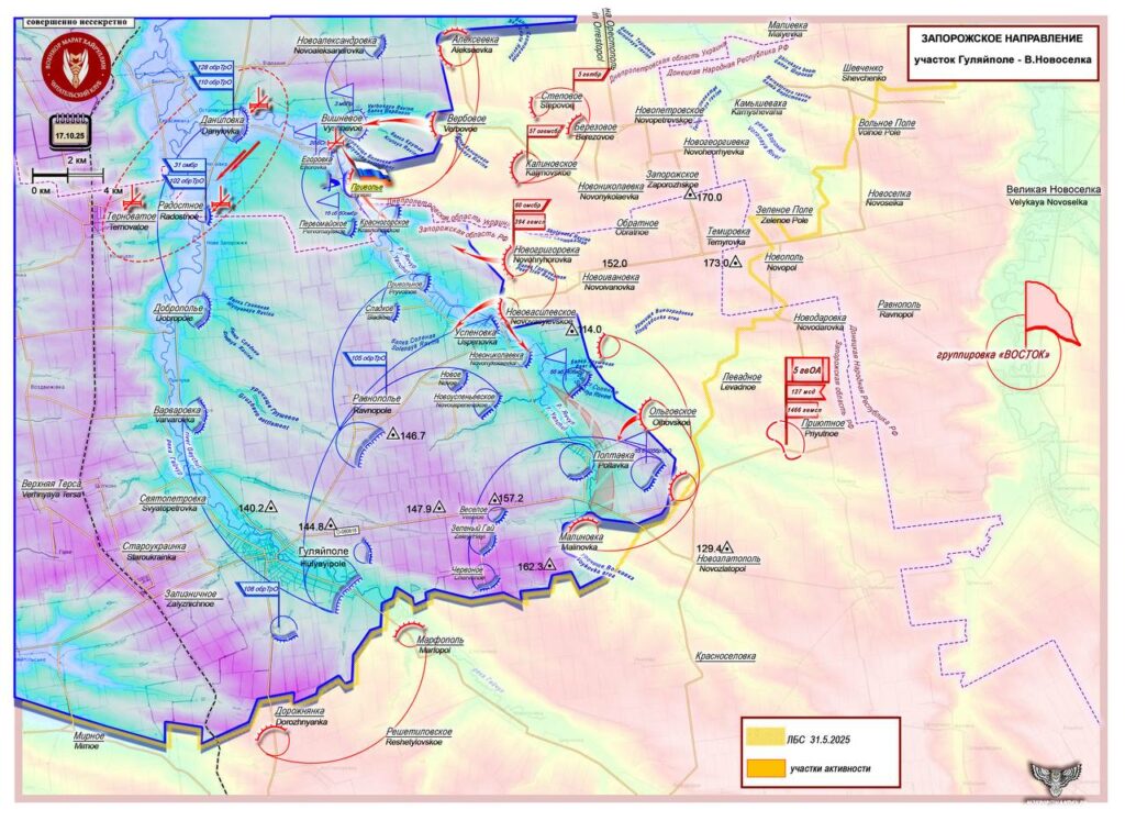 Стабильное продвижение ГрВ «Восток» на этом участке достигается благодаря гряде господствующих высот (около 150 м), которые берут своё начало в районе Новополя. Воздушное пространство на Днепропетровском направлении активно патрулирует звено Су-35С, что минимизирует применение авиацией ВСУ по свежезанятым российской армией опорным пунктам планирующих бомб JDAM-ER и AASM-250 HAMMER.