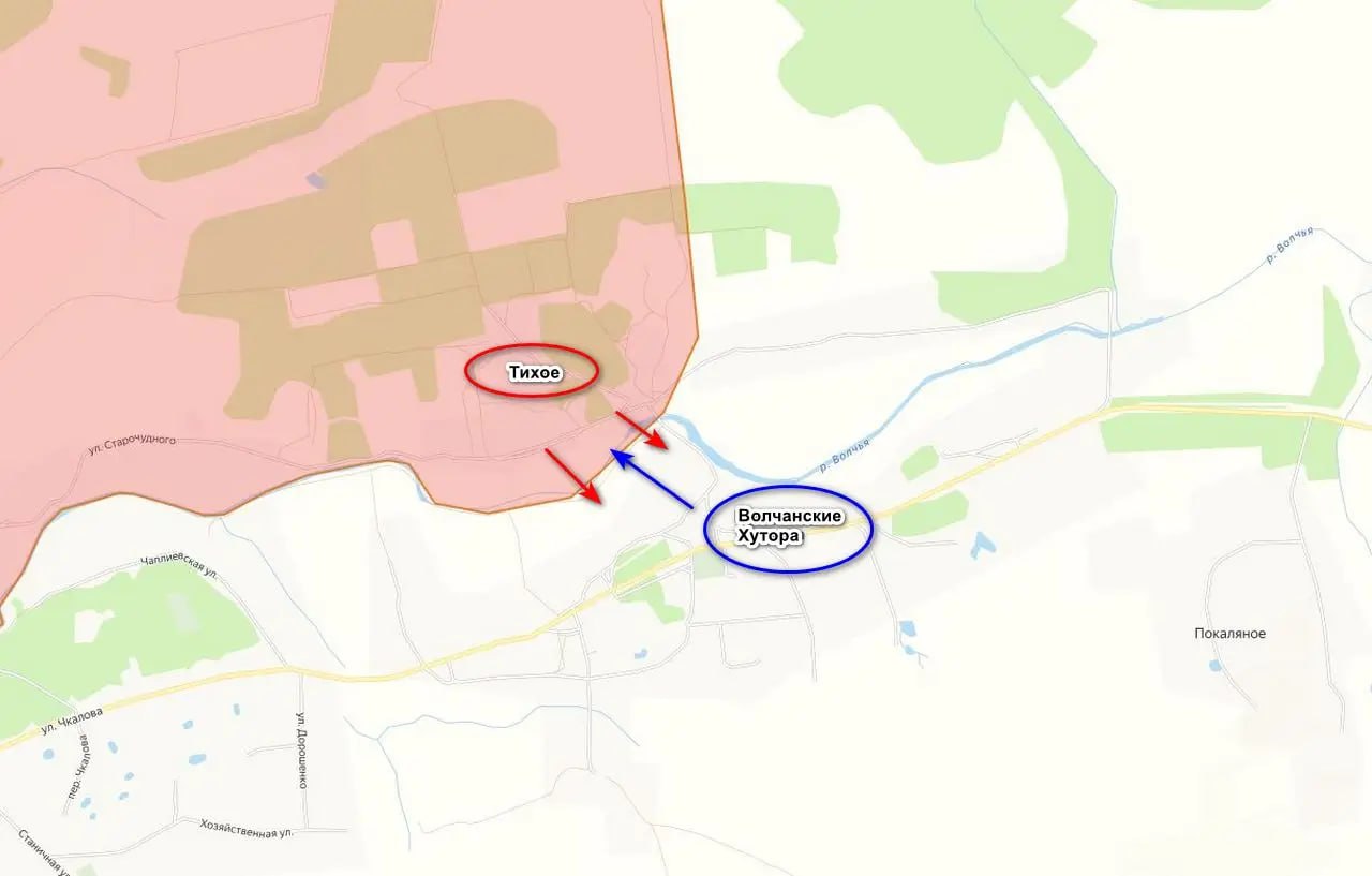 На Харьковском участке после вчерашнего освобождения села Тихого возобновились бои южнее, у Волчанских Хуторов, через которые проходит рокада вдоль госграницы на участок Охримовка — Варварка. Этот путь обеспечивает манёвренные группы ВСУ, ведущие обстрелы Белгородской обл. Выход наших войск к Волчанским Хуторам нарушит взаимодействие группировки ВСУ в Волчанске с группами, стоящими правее в приграничной зоне. Пока же ВС РФ предстоит форсировать на этом участке реку Волчья.
