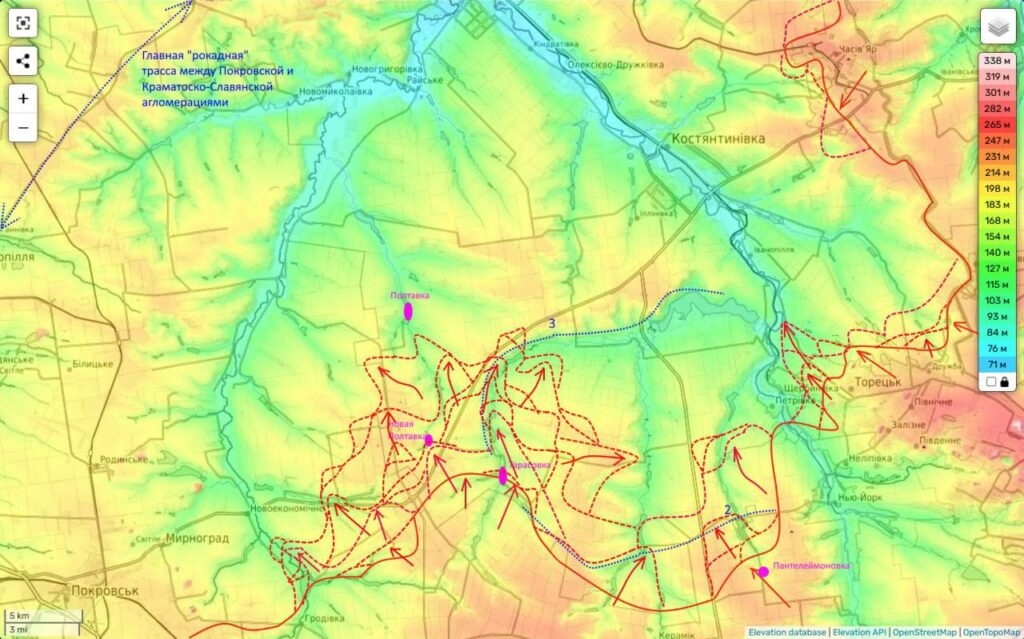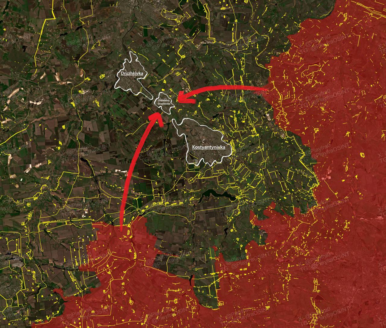 По оценкам зарубежных аналитиков, в ближайшей перспективе не стоит ожидать прямого штурма Константиновки. Вместо лобовой атаки, российская армия, судя по конфигурации боевых действий, реализует тактику охвата с двух направлений.