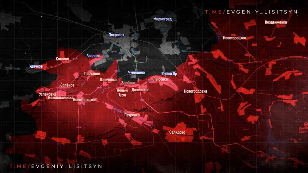 На Покровском участке ВСУ предпринимают попытки сдержать атаки ВС РФ, которые продвигаются по линии Запорожье-Троицкое-Орехово. Выше по фронту, на левом фланге охвата Покровска – тяжёлые позиционные бои без существенных перемен. На правом – такое же тяжёлое сражение в районе Малиновки.