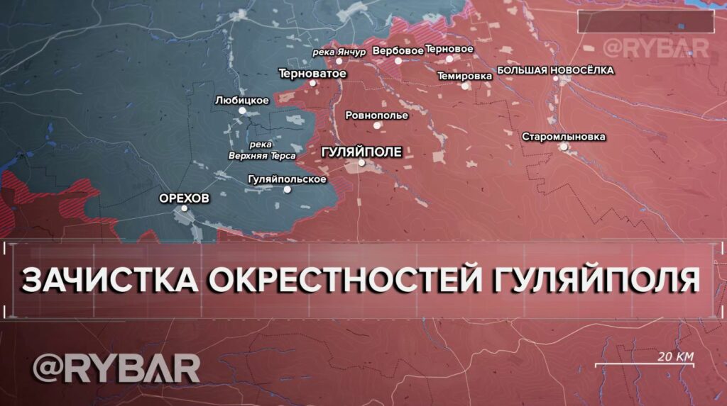 Штурмовые подразделения группировки войск «Восток» продвигаются на запад и северо-запад от Гуляй-поля. Продолжается уничтожение логистики противника западнее линии Риздвянка — Верхняя Терса. Штурмовые подразделения группировки на данном участке продолжают вести бои на подступах к Воздвижевке, Верхней Терсе, Комсомольскому, вклиниваясь в глубину обороны противника, заняв ряд опорных пунктов за сутки.