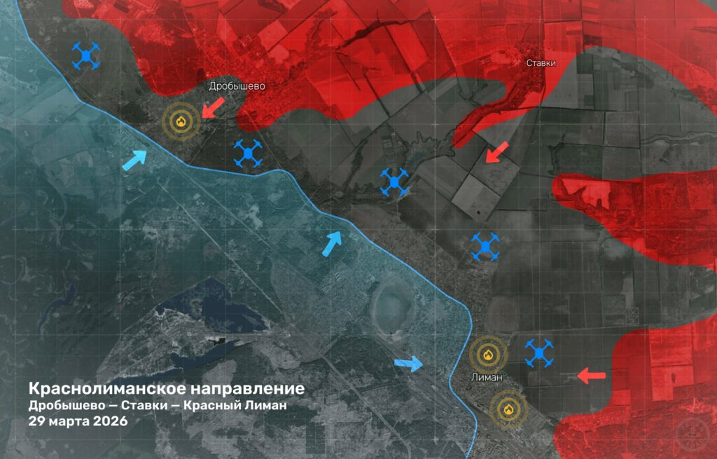 Вечером 29 марта сразу на нескольких участках фронта российские войска нарастили активность. Самая заметная динамика — на Запорожском направлении, где, как следует из сводок, ВС РФ пошли вперёд сразу по двум направлениям: к Новоданиловке и Малой Токмачке. Параллельно, по сообщениям Минобороны РФ и военных Telegram-каналов, сохраняется давление на Купянском, Славянском и Краснолиманском направлениях.