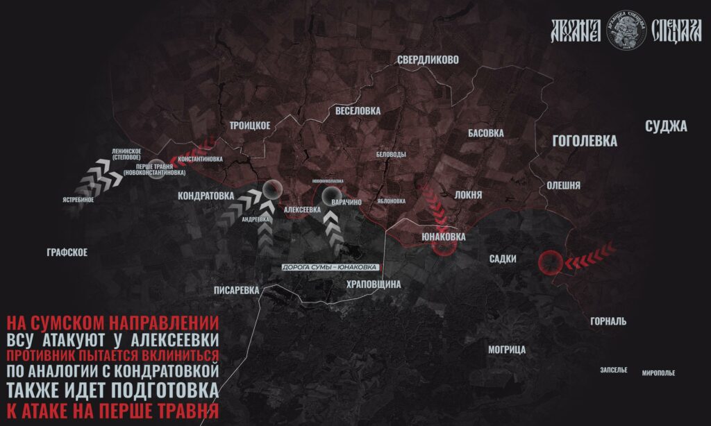 В Сумской области продолжается контратака украинских формирований, которые интенсивно наступают. В настоящее время основные усилия противника сконцентрированы на Алексеевке, вокруг которой развернулись бои после освобождения Кондратовки.