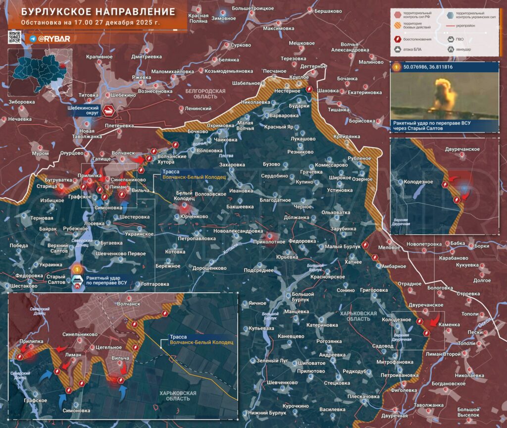 В районе Меловое-Хатнее Северяне продолжили расширять зону контроля возле российской границы и продвинулись на 700 м. Ударами БпЛА «Герань-2» уничтожены позиции и склады 3 отмбр ВСУ в районе Великого Бурлука. Расчеты ТОС-1А нанесли удары по скоплениям личного состава 1 обр ТРО в районе Ольховатки. На Липцовском участке фронта без существенных изменений. Расчеты FPV и артиллерия ГВ «Север» уничтожали транспорт и средства РЭБ ВСУ в районе Липцов, — Веверный Ветер.