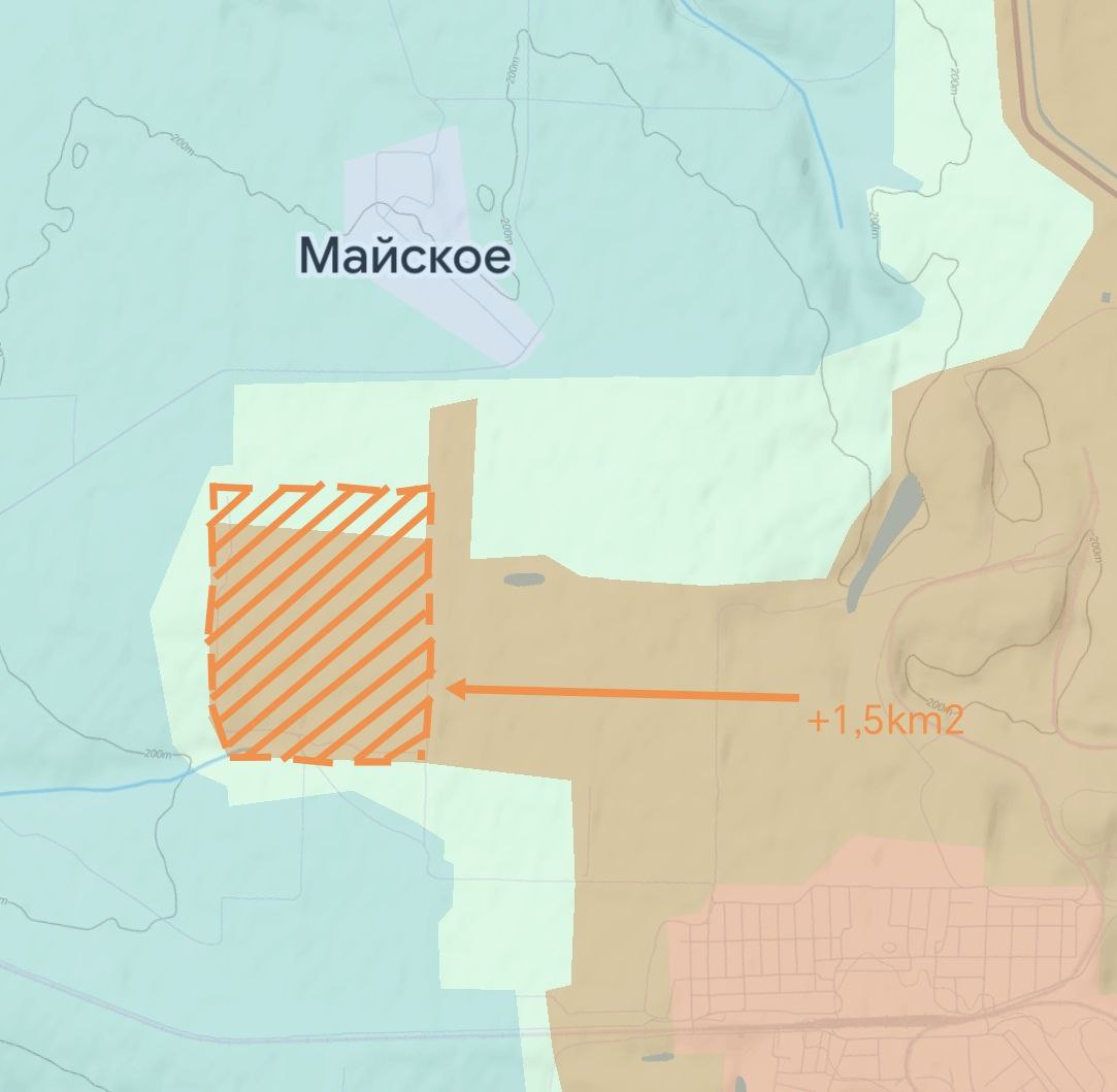 Российская армия заняла территорию к югу от села Майское, увеличив контролируемую площадь на 1,5 квадратных километра.