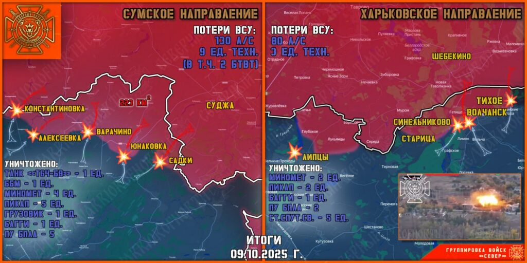 Штурмовые группы Северян продолжают продвижение по лесополосам вглубь Сумской области, при поддержке авиации ВКС РФ и артиллерии группировки «Север». Противник активных действий не предпринимал. Командование ВСУ изыскивает резервы для доукомплектования штурмовых групп 71 оебр и 225 ошп. В учебные центры направлены рекрутеры для набора новобранцев и восстановления наступательного потенциала.