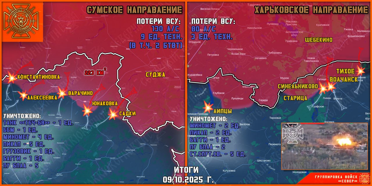 В Сумском приграничье ВСУ предпринимают отдельные атаки у Тёткино. В районе Юнаковки тяжёлые позиционные бои, противник использует большое число дронов, не позволяя нашим военным продвигаться вперёд. Со стороны Андреевки ВСУ пытались отрезать Алексеевку с севера, но безуспешно. Упорные бои продолжаются в районе Варачино и на участке Константиновка-Кондратовка.