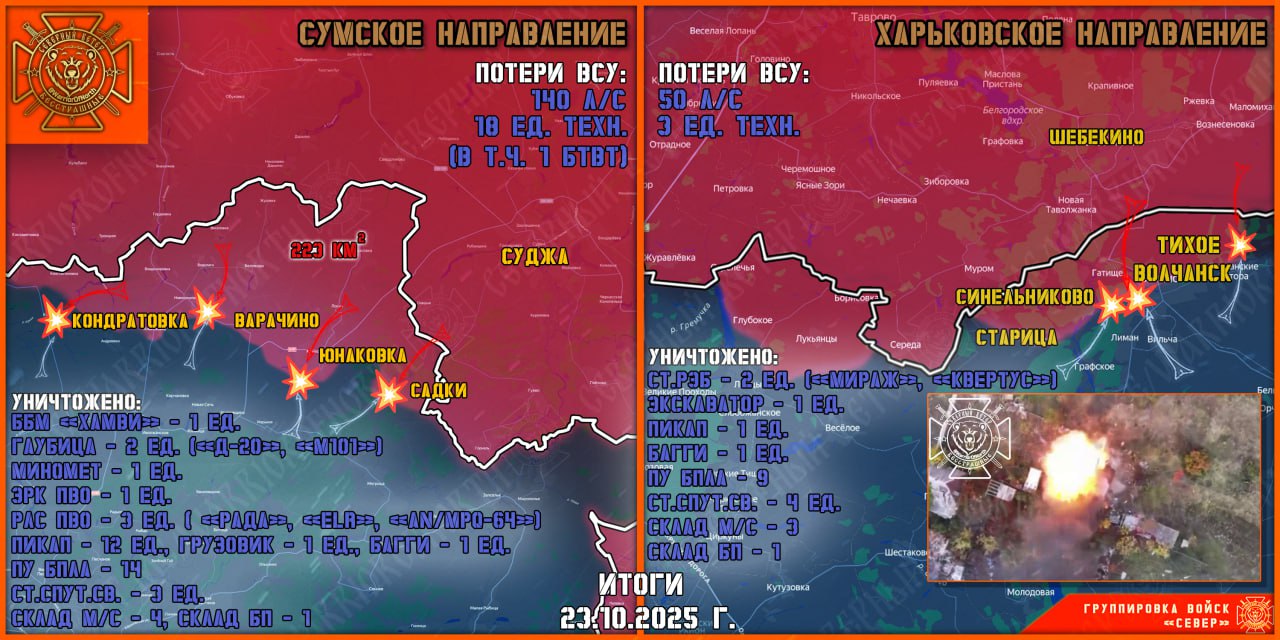 В Сумском приграничье фронт без изменений. ВСУ предпринимают безуспешные попытки контратак в районе Алексеевки, Кондратовки и Варачино. На правом фланге наступления десантники и морпехи группировки «Север» продолжают продавливать оборону ВСУ. Активную поддержку им оказывает авиация ВКС РФ и тяжелая реактивная артиллерия. Противник активных действий не предпринимал и восстанавливает боеспособность.