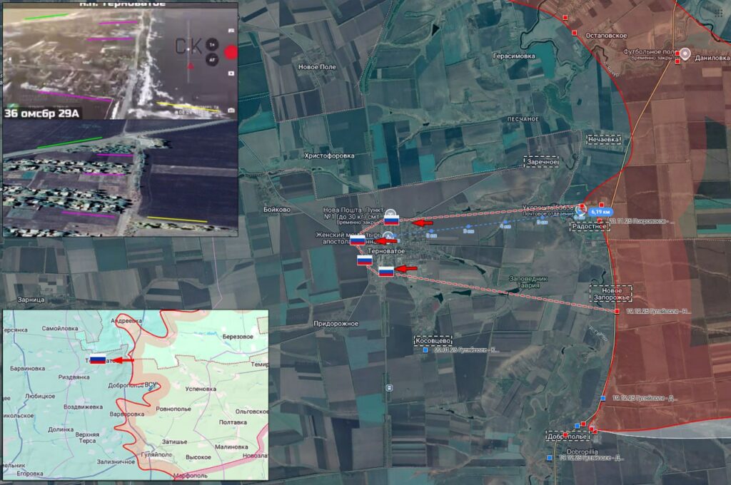 Подразделения ГрВ «Юг» продолжают развивать наступление и отражают контратаки противника. Обстановка на направлении остаётся сложной. Противник стремится вернуть контроль над утраченными позициями или хотя бы остановить продвижение наших подразделений. На направление переброшены дополнительные силы подразделений БпЛА ВСУ. ВС РФ продолжают бои в Никифоровке и окрестностях. Нашим группам удалось продвинуться в посадках на склоне высот западнее Бондарного и южной части Никифоровки (севернее балки Копанки) и занять район высоты с отм. 195,5, выйдя в тыл опорному пункту ВСУ на склоне высоты в северной части балки.