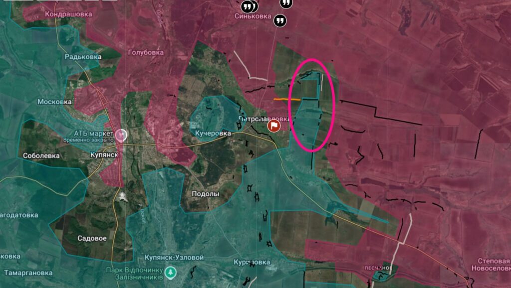Сражение за Купянск продолжается. На восточном берегу ВС РФ ведут бои за центр Подолов. В районе Петропавловки ожесточённые бои, наши войска стараются дожать ВСУ и захлопнуть «карман» по линии Петропавловка-Подолы. На заоскольском плацдарме ВС РФ начали продвигаться от Двуречной к Кутьковке, стараясь занимать позиции на высотах между Кутьковкой и Дорошовкой. Ещё выше по карте есть тактические успехи в районе Митрофановки и Нововасильевки.