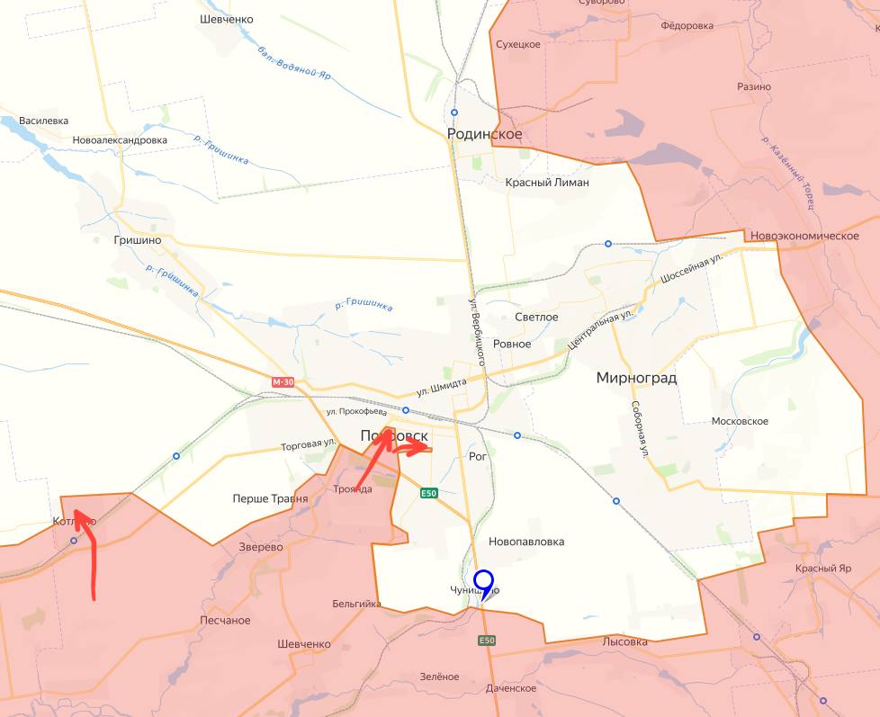 На Покровском фронте ВСУ контратакуют в районе Удачного, ситуация остаётся весьма напряжённой. В юго-западной части Покровска интенсивные бои. В Троянде ВСУ пока удерживают оставшиеся позиции. В районе Чунишино позиционные бои. На восточном фланге продолжается сражение за южную часть Новоэкономического, а ВКС РФ системно наносят авиаудары по военным объектам противника в Мирнограде. К северу от Мирнограда без изменений.