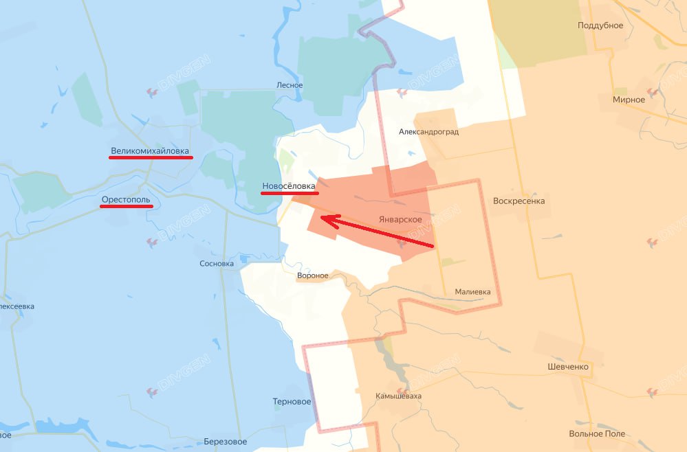 Сейчас для вражеских сил создаётся угроза разрыва логистической связи Великомихайловка-Орестополь (оба села относятся к бывшему Покровскому району Днепропетровской области (не путать с одноимённым районом ДНР). Между этими населёнными пунктами, которые с недавних пор стали относиться к Синельниковскому району, находится активно используемый ВСУ мост через реку Волчья.