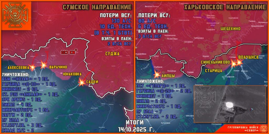 В Сумском приграничье позиционные бои в районе Алексеевки. Противник контратаковал в районе Кондратовки, понёс потери. На отдельных участках наши войска закрепились на новых позициях. Российская авиация и артиллерия группировки «Север» продолжали наносить удары по скоплениям живой силы и техники ВСУ, поддерживая продвижение штурмовых подразделений. Противник безуспешно пытался контратаковать.