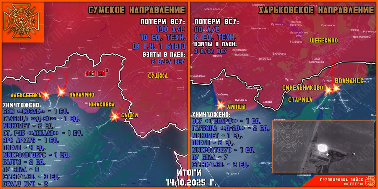 В Сумском приграничье позиционные бои в районе Алексеевки. Противник контратаковал в районе Кондратовки, понёс потери. На отдельных участках наши войска закрепились на новых позициях. Российская авиация и артиллерия группировки «Север» продолжали наносить удары по скоплениям живой силы и техники ВСУ, поддерживая продвижение штурмовых подразделений. Противник безуспешно пытался контратаковать.