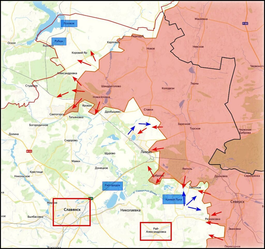 На Краснолиманском направлении российские войска расширили зону контроля на южных подступах к Красному Лиману, а также на севере города. Здесь, атакуя от Яра Пинькова, ВС РФ вклинились в оборону города. ВСУ контратакуют из района Ставков, пытаясь срезать российский выступ. Северо-восточнее наши штурмовые группы стремятся закрыть «карман» на севере от Яра Пинькова. Есть успехи в лесах между Новосёловокй и Яровой. Вдоль р. Северский Донец наши продвигаются на восточной окраине Святогорска. Выше по фронту обходят по флангам Коровий Яр с прицелом на Лозовое. Противник концентрирует силы у Богуславки для контратаки.