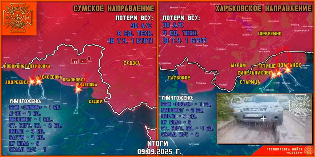 В приграничных населенных пунктах Сумской области, подконтрольных ВСУ. Местные жители остались без продовольствия и медицины из-за того, что всех водителей, подвозивших в местные магазины еду, и медиков мобилизовали ТЦК. За сутки противник предпринял три попытки контратак: две в районе Андреевки силами 225 ошп и одну в районе Алексеевки силами 78 одшп. В результате стрелковых боев и комплексного огневого воздействия атаки отражены. Враг с потерями отошел на исходные позиции.
