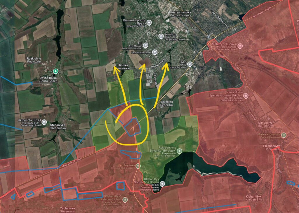 Западные СМИ и аналитики всё чаще пишут о том, что группировка ВСУ в Константиновке оказалась в «почти безвыходной ситуации». По их данным, российские штурмовые подразделения прорвали украинские укрепления в районе пересечения трасс Н-20 и Н-32 и начали продвижение в сторону Ильиновки, фактически выходя к городской черте. Внутри города эшелонированной обороны, сопоставимой с внешним периметром, практически нет, поэтому дальнейшее продвижение для РФ может быть менее сложным.
