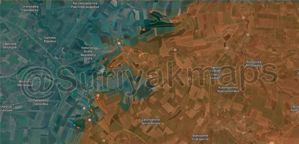 Кроме того, российские силы продолжили продвижение в сторону хутора Фёдоровка после закрепления к юго-западу от Никифоровки и начали штурм позиций к северу от Пазено.