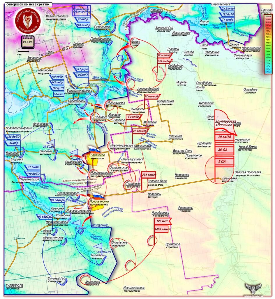 Подразделения группировки Днепр: На Ореховском направлении, в районе Новоданиловки и Малой Токмачки идут позиционные бои, линия боевого соприкосновения без изменений. Подразделения ВС РФ продвинулись на южных окраинах Приморского и заняли новые позиции, расширив зону контроля в районе Степногорска. В небе фиксируется большое количество ударных и разведывательных БПЛА. Российская артиллерия и авиация ведут активную совместную работу по подавлению противника, нанося удары по пунктам временной дислокации живой силы и бронетехники как на линии боевого соприкосновения, так и в тыловых районах сосредоточения.