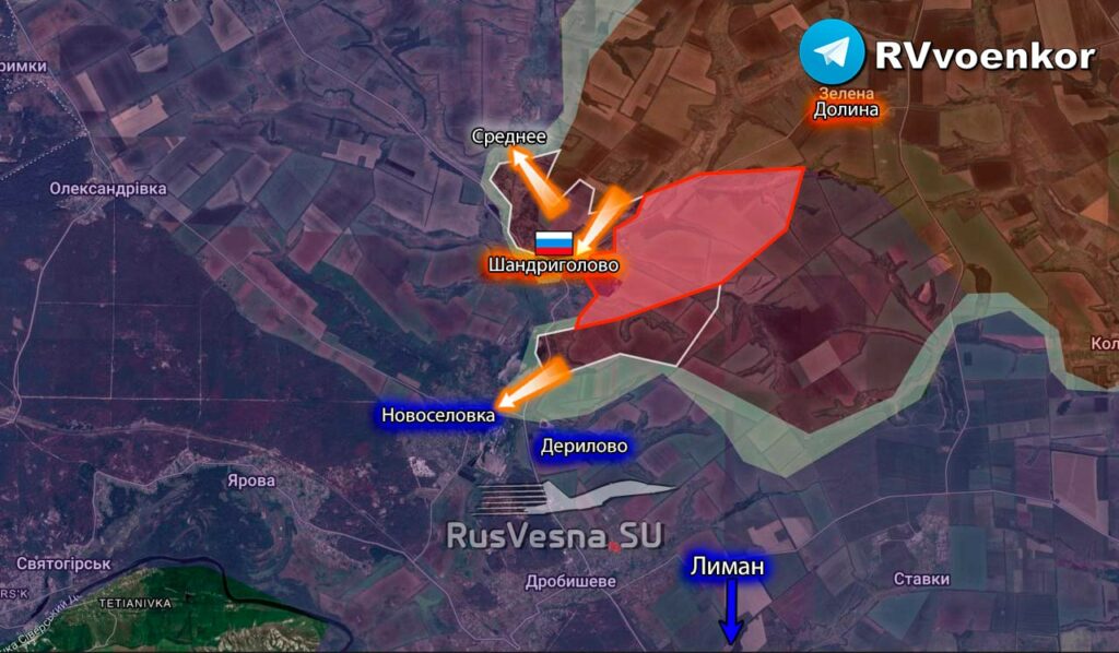 Продолжая наступление на Краснолиманском направлении российские войска выбили подразделения ВСУ из последних домов в Шандриголово. Площадь продвижения: более 2 км². Также ВС РФ продвинулись в соседнем Среднем и закрепляются в районе центра посёлка. Южнее наши поздравления штурмуют лесополосы, продвигаясь к Дерилово и Новосёловке.