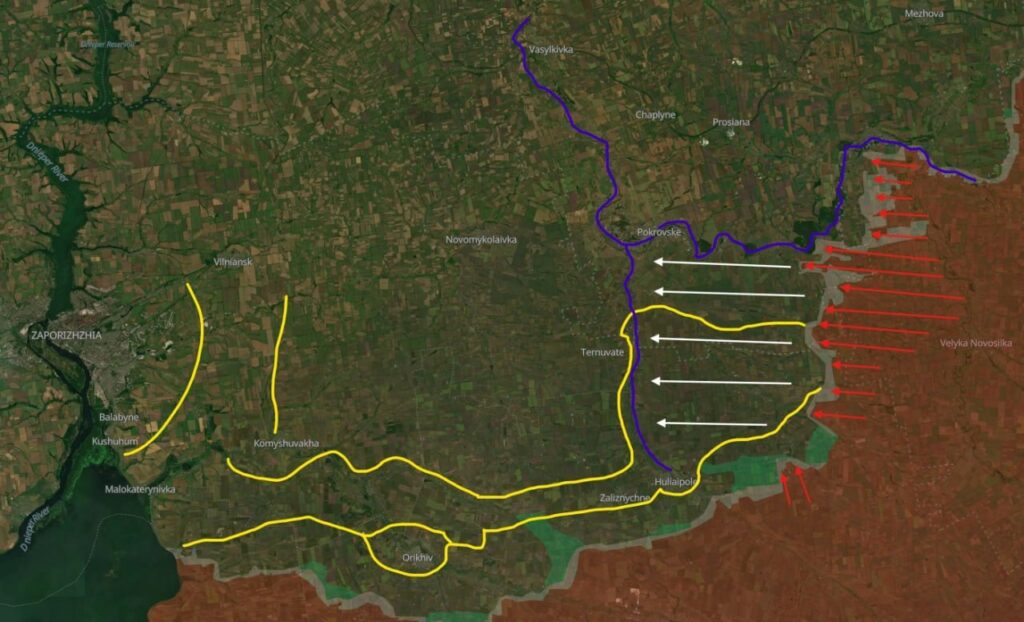 На Запорожском участке идут тяжёлые бои в районе Приморского и Степногорска, без заметных изменений. В районе Орехова тоже позиционные бои. Восточнее, в районе освобождённого Ольговского, наши зачищают поля и опорные пункты южнее, у Вишнёвого. ВС РФ, похоже, нацелены на рубеж Малиновка – Полтавка с перспективой выхода во фланг группировке ВСУ в Гуляйполе. ВСУ били по гражданским в Васильевке —разрушена действующая часовня, есть раненые. Российские войска выбили подразделения ВСУ из села Новоивановка на северо-востоке Запорожской области, сообщил РИА Новости Рогов.