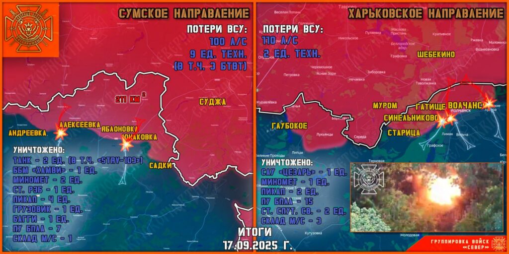 С Сумского участка сообщают, что враг бросил в самоубийственную атаку свои силы у Тёткино и понёс большие потери. В районе Алексеевки и Садков было несколько безуспешных контратак в течение суток. Продолжаются бои в районе Юнаковки. Враг оказывает ожесточённое сопротивление и не оставляет попыток прорвать фланги наступающей группировки Северян. Авиация ВКС РФ и артиллерия группировки «Север» продолжали работать в интенсивном режиме. Противник провел одну контратаку в районе Алексеевки штурмовой группой 78 одшп, успеха не имел, с потерями отошел на исходные позиции.