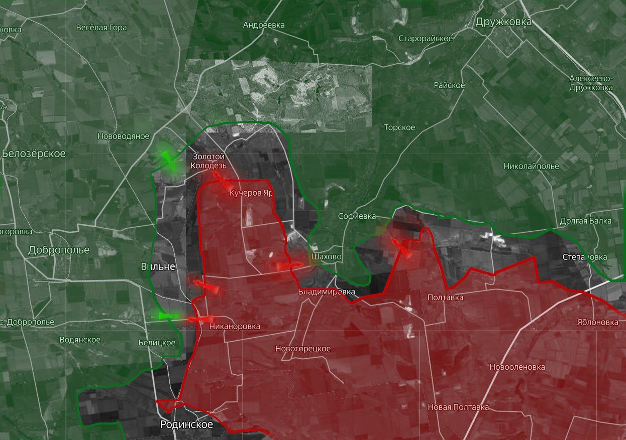 На Константиновском участке в районе Полтавки без изменений. Севернее Торецка ВС РФ зачищают дачи неподалёку от Александро-Шультино. От Часов Яра наши войска продвинулись севернее дороги на Константиновку. У противника сетуют на успехи армии Росси в районе Ступочек и Предтечино.
