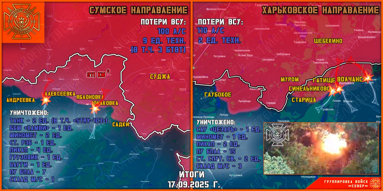 С Сумского участка сообщают, что враг бросил в самоубийственную атаку свои силы у Тёткино и понёс большие потери. В районе Алексеевки и Садков было несколько безуспешных контратак в течение суток. Продолжаются бои в районе Юнаковки. Враг оказывает ожесточённое сопротивление и не оставляет попыток прорвать фланги наступающей группировки Северян. Авиация ВКС РФ и артиллерия группировки «Север» продолжали работать в интенсивном режиме. Противник провел одну контратаку в районе Алексеевки штурмовой группой 78 одшп, успеха не имел, с потерями отошел на исходные позиции.