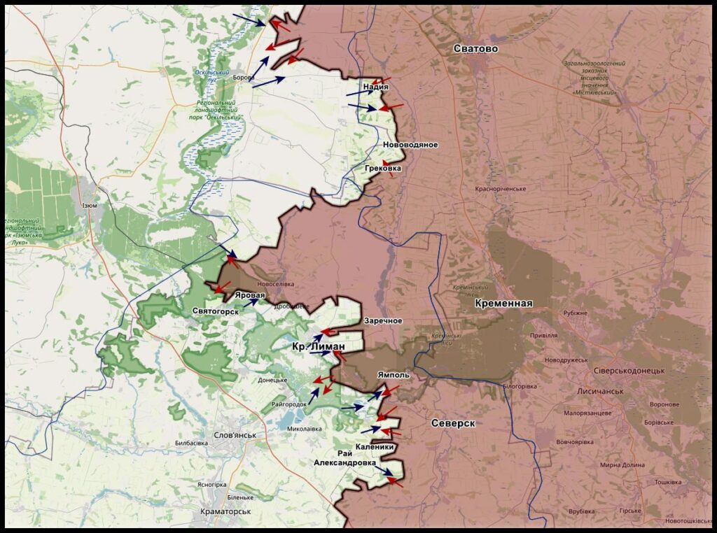 На Краснолиманском участке идут вязкие, тяжёлые бои за город. ВСУ пытаются пробиться малыми группами на подмогу своим со стороны Щурово, большую часть этого подкрепления ВС РФ вскрывают и уничтожают в лесах.