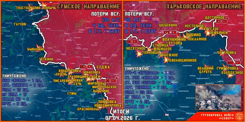 На Липцовском направлении без существенных изменений. Артиллеристы и операторы БпЛА Северян наносили удары по ранее вскрытым целям противника. На Волчанском направлении штурмовые группы Северян продвинулись на одиннадцати участках до 400 метров. В районе Волчанских Хуторов продолжаются ожесточенные стрелковые бои, наши штурмовые группы зачищают лесные массивы около Верхней Писаревки, а также уничтожают разрозненные группы националистов вблизи государственной границы на рубеже Зыбино — Волоховка — Охримовка. На Великобурлукском направлении наши штурмовые группы продвинулись на трёх участках до 700 метров, — Северный Ветер.