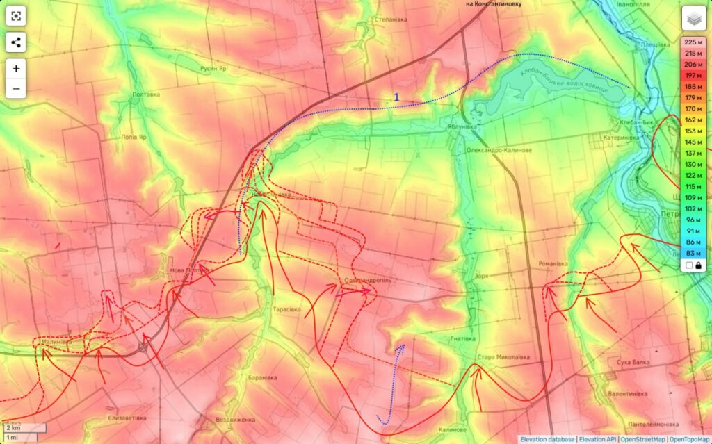 Западнее Торецка ВС РФ продолжают демонтаж оборонительной линии одного из самых подготовленных укрепрайонов ВСУ. Продвижение идёт в районе Новой Полтавки, а также на запад по линии Новооленовка-Александрополь к Яблоновке, Александро-Калиново и Заре. Пусть продвижение и небыстрое, однако довольно угрожающее для обороны ВСУ в Константиновке, что в 15 км севернее. Для перспективного охвата Константиновки ВС РФ пробиваются также к Катериновке и в район Клебан-Быка, а также на востоке, на Часовярском участке, в районе Ступочек. В окрестностях Торецка напряженно: наши контролируют практически весь город, однако ВСУ постоянно пытаются контратаковать. По данным с мест, ВСУ удалось закрепиться лишь в районе автобазы на въезде в город.