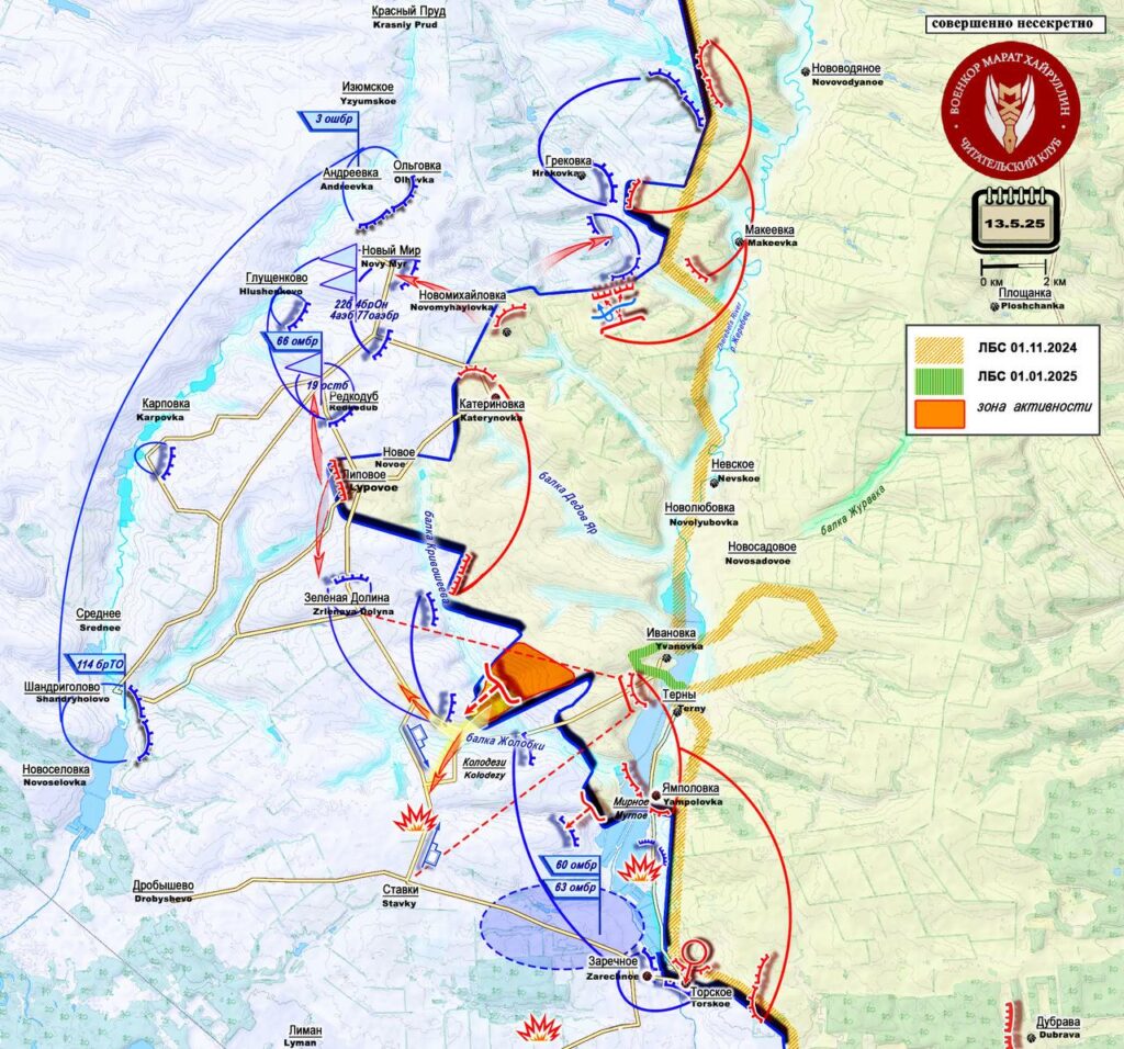 На Северском участке ВС РФ, прорвав оборону ВСУ в Верхнекаменском, ведут бои в промзоне на юге села. Не стихают бои южнее Григоровки, в районе Белой горы.