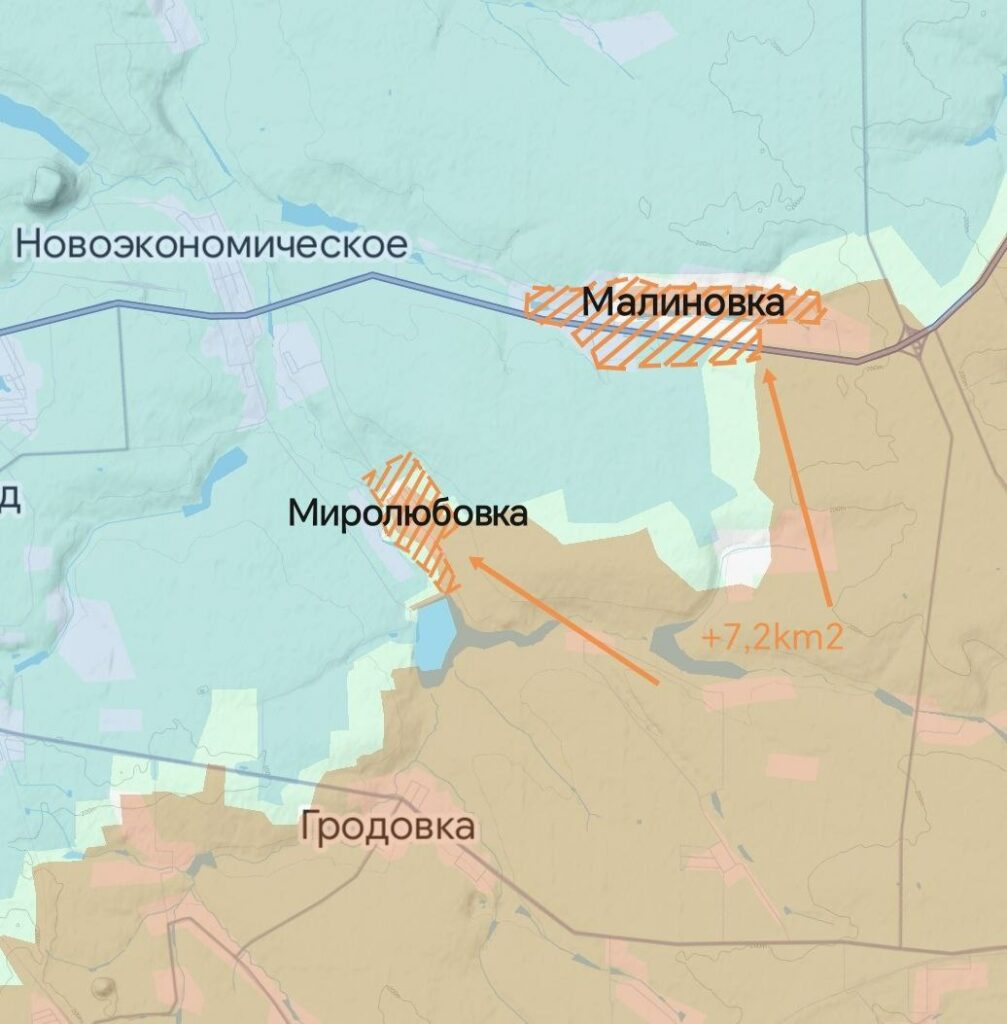На Покровском участке в районе Котляровки ВСУ безуспешно сопротивляются наступлению ВС РФ в сторону Днепропетровской обл. Наши же выбивают ВСУ из Новосергеевки. На восточном охвате Покровска Минобороны объявило об освобождении Миролюбовки – небольшого села на берегу реки Казённый Торец в 3 км к югу от важнейшей трассы, соединяющей Покровска-Мирноградскую агломерацию с Константиновкой. По оперативным данным, армия России освободила и соседнюю Малиновку – центральный узел обороны ВСУ на этом участке. Дальше – Новоэкономическое, к которому наши войска идут с востока, от Малиновки, и с юга, от Миролюбовки. Контроль над Новоэкономическим открывает нашим войскам выход на Мирноград и Родинское – логистический центр ВСУ.
