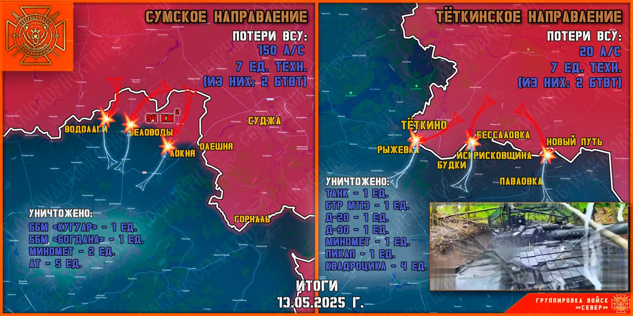В Сумской обл ВС РФ улучшают позиции в районе Локни. По последним данным, наши войска зачистили Беловоды и зашли в село Водолаг. Северяне продолжают перемалывать личный состав ВСУ, создавая полосу безопасности.