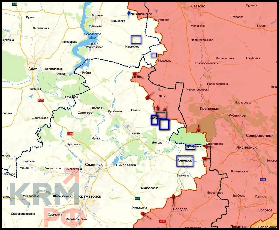 На Краснолиманском фронте кипят бои в северной части Торского, наши рвутся вдоль дороги от Кременной к южным окраинам этого села. Идут встречные столкновения на северных окраинах Колодезей и в центре Редкодуба. С рубежа Макеевка — Новомихайловка ВС РФ двигаются в направлении Грековки, Ольговки и Нового Мира.