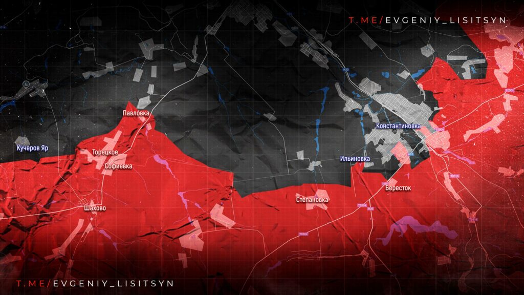 На Константиновском участке активные боевые действия в районе Берестка и Ильиновки. Наши дронщики уничтожили несколько ПВД ВСУ в Николайполье южнее Дружковки. Сообщают о занятии новых позиций к югу от вокзала Константиновки. В Часов Яре противник подтягивает силы и укрепляет свои позиции.