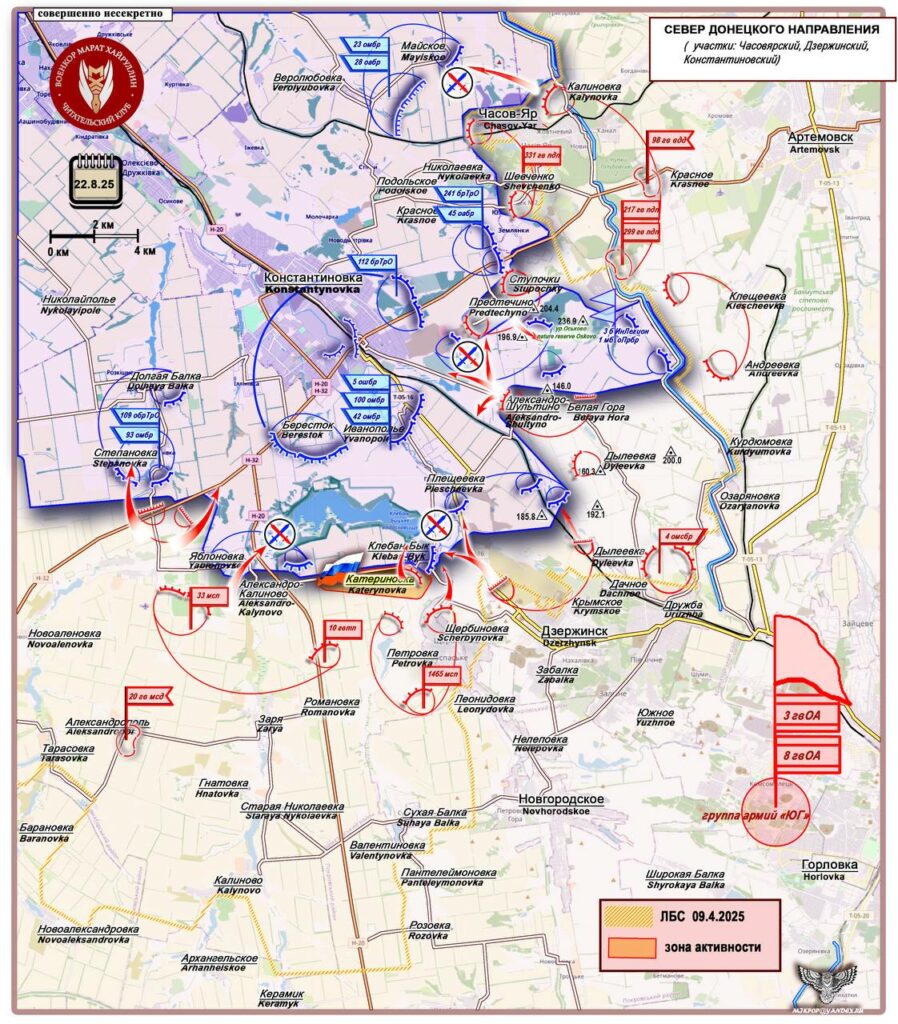 На западном фасе Константиновского направления ВС РФ зашли в западную часть Шахово. Также наши прорвались севернее в районе Софиевки, перерезали трассу на Константиновку и взяли под огневой контроль дорогу на Дружковку. Восточнее ВС РФ продвигаются в окрестностях освобождённого Русин Яра, что угрожает тылу и флангу ВСУ, которые пытаются остановить наш прорыв в направлении Маяк-Кучеров Яр. На юге от Константиновки наши увеличили зона контроля к востоку от Катериновки, также под контроль ВС РФ перешел посёлок Клебан-бык. По линии Клебан-Бык — Александро-Калиново проходит горловина котла, в который угодила крупная группировка ВСУ. Плюс посёлок стоит на возвышенности, откуда наши дроноводы держат под огневым контролем почти всю Константиновку. Ближайшая цель наших войск – Плещеевка, откуда могут зачищать северный берег водохранилища и готовить плацдарм для давления на Константиновку с юга. Южнее Майского наши атакуют в направлении Веролюбовки и в Николаевке.