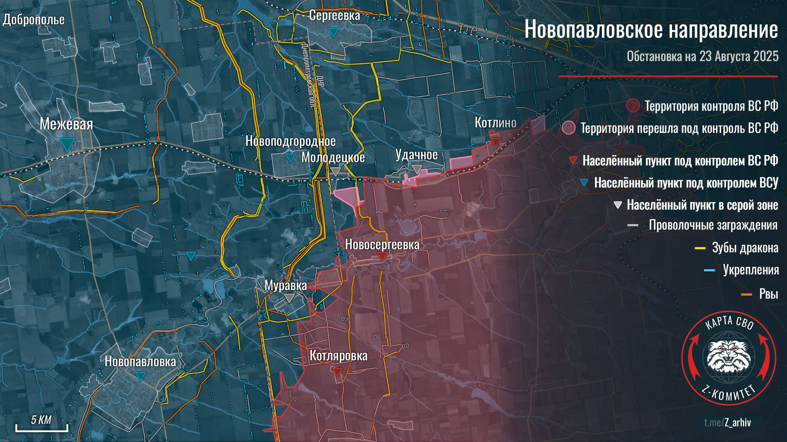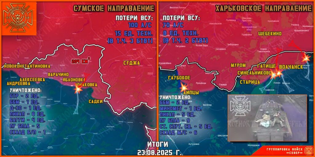 ВС РФ 24 августа зачистили район Торского и штурмуют Заречное, сжимая кольцо вокруг Северска и Константиновки, где ВСУ теряют позиции и резервы. Сырский перебрасывает батальоны с Сумского направления под Покровск, пытаясь стабилизировать рушащийся фронт, но российские войска продолжают прорыв, нанося тяжёлые потери противнику.