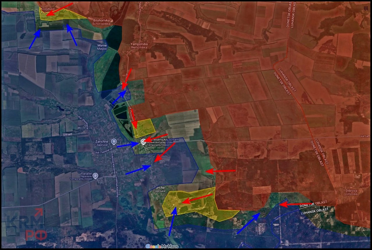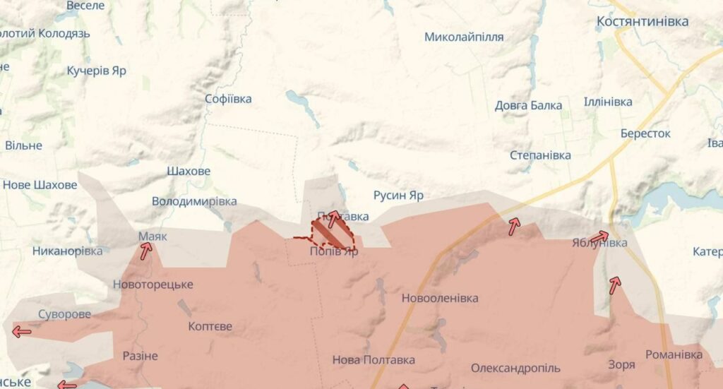 На Константиновском фронте ВС РФ стараются продавить оборону в районе Полтавки и Попов Яра, есть продвижение по лесополосам восточнее этих сёл. Южнее Клебан-Быкского водохранилища идут бои в Катериновке, и в районе Клебан-Быка. Наши части атакуют артиллерией и дронами северную часть Щербиновки. Есть продвижение южнее Александро-Шультино, ВСУ контролируют часть села севернее р. Наумиха.