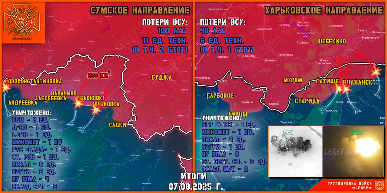 На Липцовском участке фронта без существенных изменений, ВСУ активных действий не предпринимали и оборудуют оборонительные позиции. На участке фронта Меловое-Хатнее Северяне продолжают интенсивную работу по позициям подразделений ВСУ в районе Хатнее. Задействована артиллерия, расчеты ТОС-1А «Солнцепек» и ударные беспилотники, — Северный Ветер.
