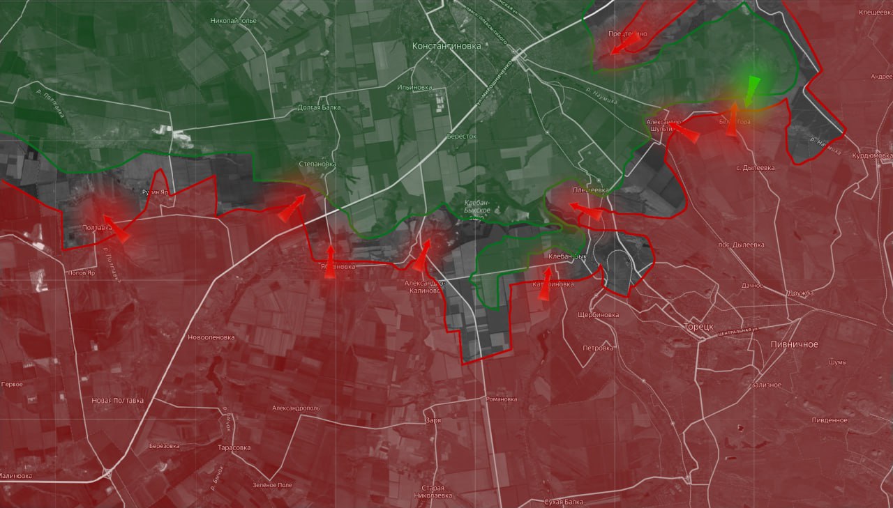 Южнее Константиновки сохраняется высокая динамика боевых действий: атаки российских сил развиваются от района Дылеевки, в зоне Белой Горы и южнее Александро-Шультино. Эти рубежи представляют собой важные опорные линии украинской обороны, и их прорыв угрожает окружением города с нескольких направлений.