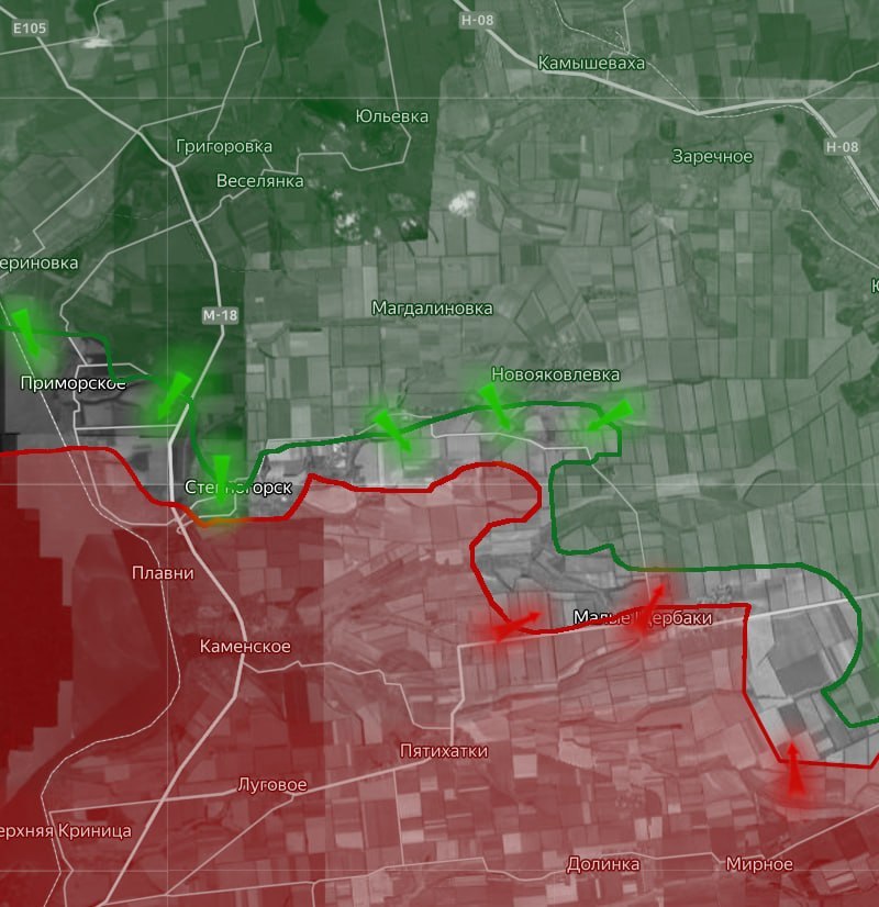 На западном фланге Запорожского участка ВСУ наносят удары не только по Приморскому и Степногорску, но и по нашим тыловым территориям. Сообщают, что у врага здесь появляются дроны новых моделей. ВС РФ наносят удары по логистике и скоплениям врага за р. Конка – в Григоровке, Малокатериновке и Кушугуме. На восточном фланге идут бои на рубежах Чаривное – Гуляйпольское и Верхняя Терса – Воздвижевка. Противник бьёт по Староукраинке и Зализничному, пытаясь нарушить наши логистические маршруты. Российские операторы дронов и артиллеристы выбивают силы врага в районе Долинки, Копаней, Червоного Яра, Любицкого.