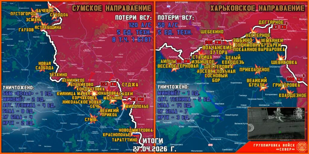 27 апреля российские войска продолжили активные действия на нескольких направлениях. Особенно заметно продвижение на Сумском и Харьковском участках, а также тяжёлые бои под Константиновкой и на Славянско-Краматорском направлении.