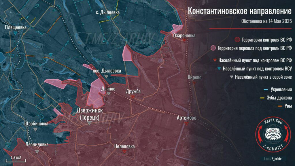 Противник опасается, что после обвала обороны Часов Яра часть наших высвободившихся войск усилит давление со стороны Клещеевки и Курдюмовки, а также по правому флангу Торецка. На этом участке ЛБС не двигался с 2023 года, и противник успел раскинуть цепь укрепов вдоль дороги через Дылеевку, Белую Гору и Александро-Шультино на Константиновку. Но взятие под огневой контроль логистики в этом районе (в первую очередь, в самой Константиновке) 100% приведет к ослаблению позиций противника по правому берегу канала Северский Донец – Донбасс.
