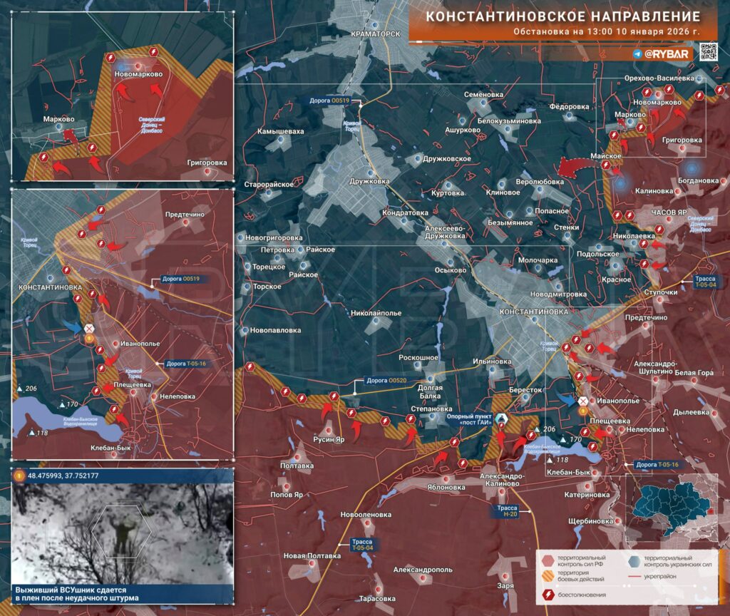 К вечеру 10 января российские войска расширили зону контроля сразу на нескольких участках фронта в Харьковской области и на севере Донбасса. Речь идёт о продвижении в районе Александровки на Изюмовском направлении, боях за укреплённые позиции под Закотным, а также о нарастающем давлении на Славянско-Краматорскую агломерацию. Обстановка остаётся динамичной: на одних участках фиксируются тактические успехи, на других — сохраняются сложности, в том числе из-за устойчивой обороны противника и проблем с логистикой.