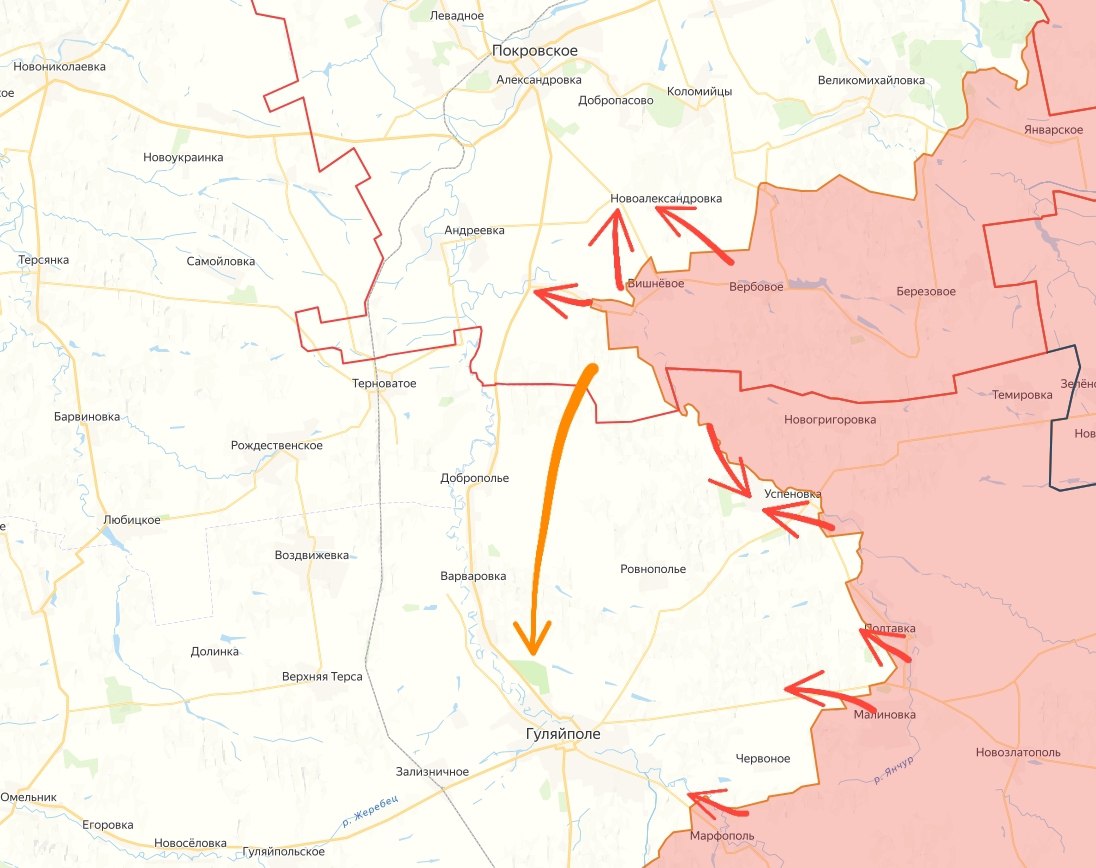 В районе Егоровки ВС РФ развили наступление на запад и зашли на окраины Даниловки, освобождение которой позволит перерезать трассу Покровское-Гуляйполе и развить наступление еще дальше на запад, в сторону Остаповского и Андреевки. После их освобождения ВС РФ займут “железобетонную” оборону вдоль трассы.