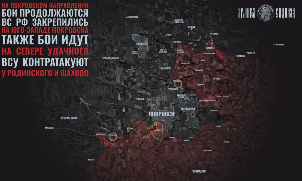 На южном участке Покровского направления ВС РФ развивает наступление на Новопавловку — важный узел ВСУ, прикрывающий правый фланг обороны Покровска и обеспечивающий снабжение. После освобождения Муравки, прикрывающего северо-восточные подходы к Новопавловке, ВС РФ разрушают логистику в этом районе — уничтожен мост через р. Солёная. Вполне вероятны атаки наших войск от Филии и Орехово тоже в направлении Новопавловки. Южнее Покровска, по последним данным, нашим не удалось закрепиться на окраине ещё одной Новопавловки: бои вновь сместились в район Чунишино. На востоке от Покровска наши FPV-дроны на оптоволокне бьют по пунктам БПЛА ВСУ в Мирнограде. Севернее армия России старается удержать позиции в Затышке, Бойковке и районе Новоторецка. ВСУ интенсивно контратакуют, пытаются перерезать основание нашего «добропольского выступа». Выше по фронту продолжаются бои за Никаноровку, Ивановку и Новое Шахово.