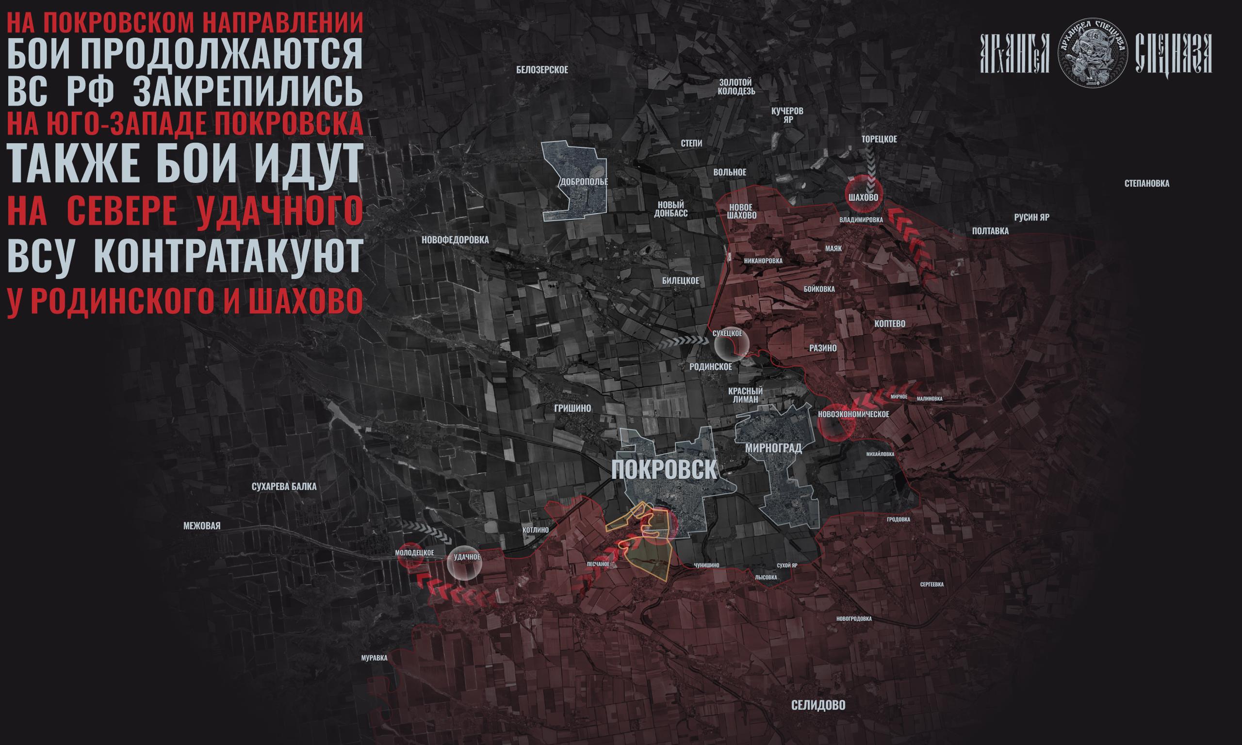На южном участке Покровского направления ВС РФ развивает наступление на Новопавловку — важный узел ВСУ, прикрывающий правый фланг обороны Покровска и обеспечивающий снабжение. После освобождения Муравки, прикрывающего северо-восточные подходы к Новопавловке, ВС РФ разрушают логистику в этом районе — уничтожен мост через р. Солёная. Вполне вероятны атаки наших войск от Филии и Орехово тоже в направлении Новопавловки. Южнее Покровска, по последним данным, нашим не удалось закрепиться на окраине ещё одной Новопавловки: бои вновь сместились в район Чунишино. На востоке от Покровска наши FPV-дроны на оптоволокне бьют по пунктам БПЛА ВСУ в Мирнограде. Севернее армия России старается удержать позиции в Затышке, Бойковке и районе Новоторецка. ВСУ интенсивно контратакуют, пытаются перерезать основание нашего «добропольского выступа». Выше по фронту продолжаются бои за Никаноровку, Ивановку и Новое Шахово.