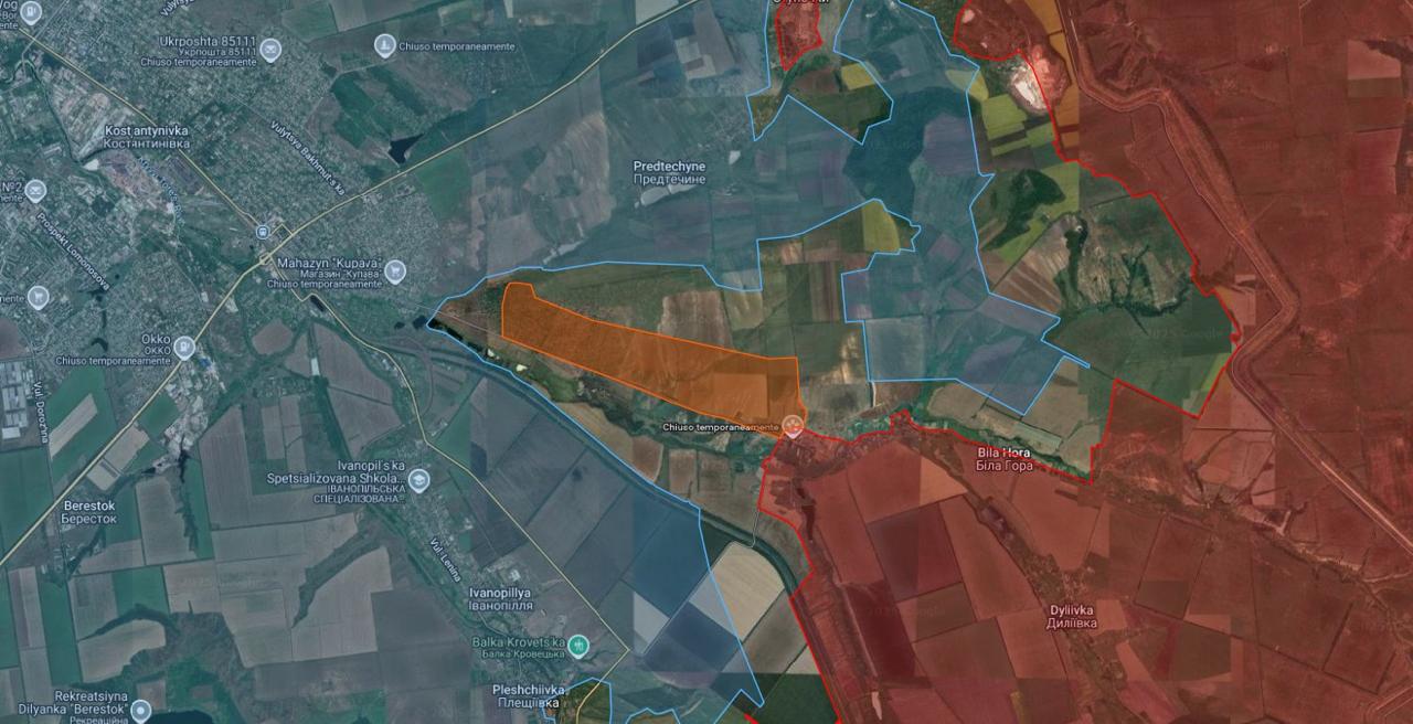 На западном участке Константиновского участка ВС РФ атакуют из района Попов Яра на Владимировку, откуда ВСУ контратакуют в Новоторецком, тоже пытаясь вбить правый клин в основание «добропольского выступа». На юге от Константиновки – бои в районе Плещеевки и Клебан-Быкского водохранилища, на востоке – сражение за участок от Александро-Шультино до Предтечино. Наши зашли в Плещеевку.
